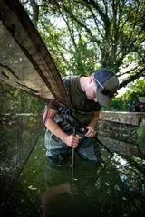 Sichere Kescherstütze hält Netz über dem Wasser