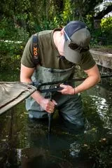 Der Fox Carpmaster Net Safe mit 3/8 BSF-Gewinde bietet ein robustes Stützsystem für Deinen Kescher, das Dein Netz sicher über dem Wasser hält und Dir ermöglicht, Fische geschützt zu hältern, während Du Dich auf das Wiegen, Fotografieren oder Lösen des Hakens vorbereitest.