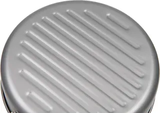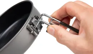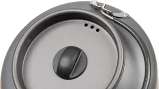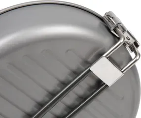 Alle vier Teile lassen sich ineinander stapeln – der 0,9-l-Wasserkessel passt in den mittleren Kochtopf, dieser in den großen Kochtopf, der wiederum in die Bratpfanne passt. Die stabilen, klappbaren Griffe rasten flach ein, und die mitgelieferte Netztasche mit Kordelzug hält alles sicher und kompakt in deiner Ausrüstung.