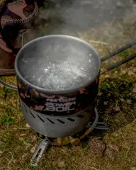 Der integrierte Wärmetauscher sitzt direkt auf dem Fox Infrared Stove und leitet die Hitze effektiver als herkömmliches Kochgeschirr. Diese Konstruktion verkürzt die Kochzeit und senkt den Gasverbrauch, sodass Sie langfristig Zeit und Geld sparen.