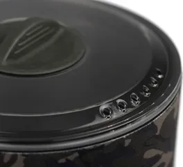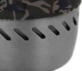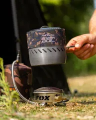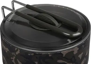 Die Fox Camo Neoprenhülle kann während des Gebrauchs am Topf bleiben und verbessert die Wärmespeicherung. Der Klappgriff sichert den Deckel für den Transport. Im Inneren des 0,65l-Topfes können Sie entweder den Infrared Stove oder eine 230g-Gaskartusche verstauen – für ein kompaktes und aufgeräumtes Setup.