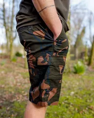 Die Fox LW Camo Combat Short vereint leichtes 150-g/m²-Baumwoll-Elastan-Gewebe mit Cargotaschen und teils elastischem Bund. Praktische Camo-Shorts für Komfort und Stauraum bei langen Karpfenansitzen.