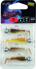 Vier vormontierte UV-aktive Gummiköder auf 3-g-Jigköpfen mit Größe-4-Haken, sofort einsatzbereit für Barsch, Zander und Forelle in flachem bis mitteltiefem Wasser. Enthält Green Pumpkin UV, Sun Dance UV, Wakasagi UV und Motor Oil UV.