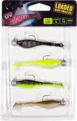Vier UV-reaktive Mini-Fry-Gummifische vormontiert auf 5-g-Jigköpfen mit Einzelhaken Größe 1/0. Die Farben UV Nightmare, UV Chartreuse Ayu, UV Glow Perch und UV Wakasagi überzeugen bei wenig Licht auf Barsch, Zander und Forelle.
