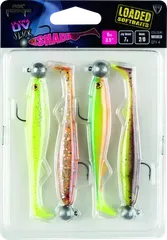 Vier vormontierte Fox Rage Slick Shad Gummiköder in UV-reaktiven Farben (Pearl, Pink Candy, UV Perch, UV Stickleback), fachgerecht auf 7g Jigköpfen mit 2/0 Haken für sofortigen Angeleinsatz auf Barsch, Zander, Bass und Hecht.