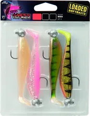 Vier Fox Rage Zander Pro Shads vormontiert auf 10-g-Jigköpfen mit 3/0-Haken in ultra-UV-Farben: Pearl, Pink Candy, UV Perch und UV Stickleback. Sofort einsatzbereit für Zander, Barsch und Hecht.