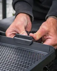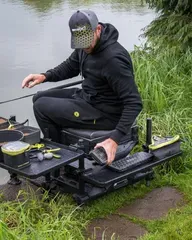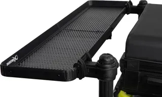 Die Matrix Faltbare schmale Seitenablage (Folding Side Tray Slim, 80×20 cm, 1.400 g) klemmt an Sitzboxbeine mit 25–36 mm Durchmesser und faltet auf 40 cm Transportmaß. Der starke Rahmen und die perforierte Oberfläche halten deinen Angelplatz beim Feederangeln im Süßwasser sauber und geordnet.