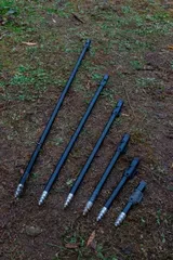 Die Power-Point-Spiralspitze schraubt sich mit dem T-Griff in festen Boden, Kies oder Lehm – der Griff steckt im Innenrohr, sodass du nie mehr zum Zelt zurücklaufen musst, um ihn zu suchen. Der Spiralschaft passt sauber durch Black-Label-Stabilisatoren, Cam-Loks, Pods und Stage Stands, damit dein gesamtes System modular und aufgeräumt bleibt.